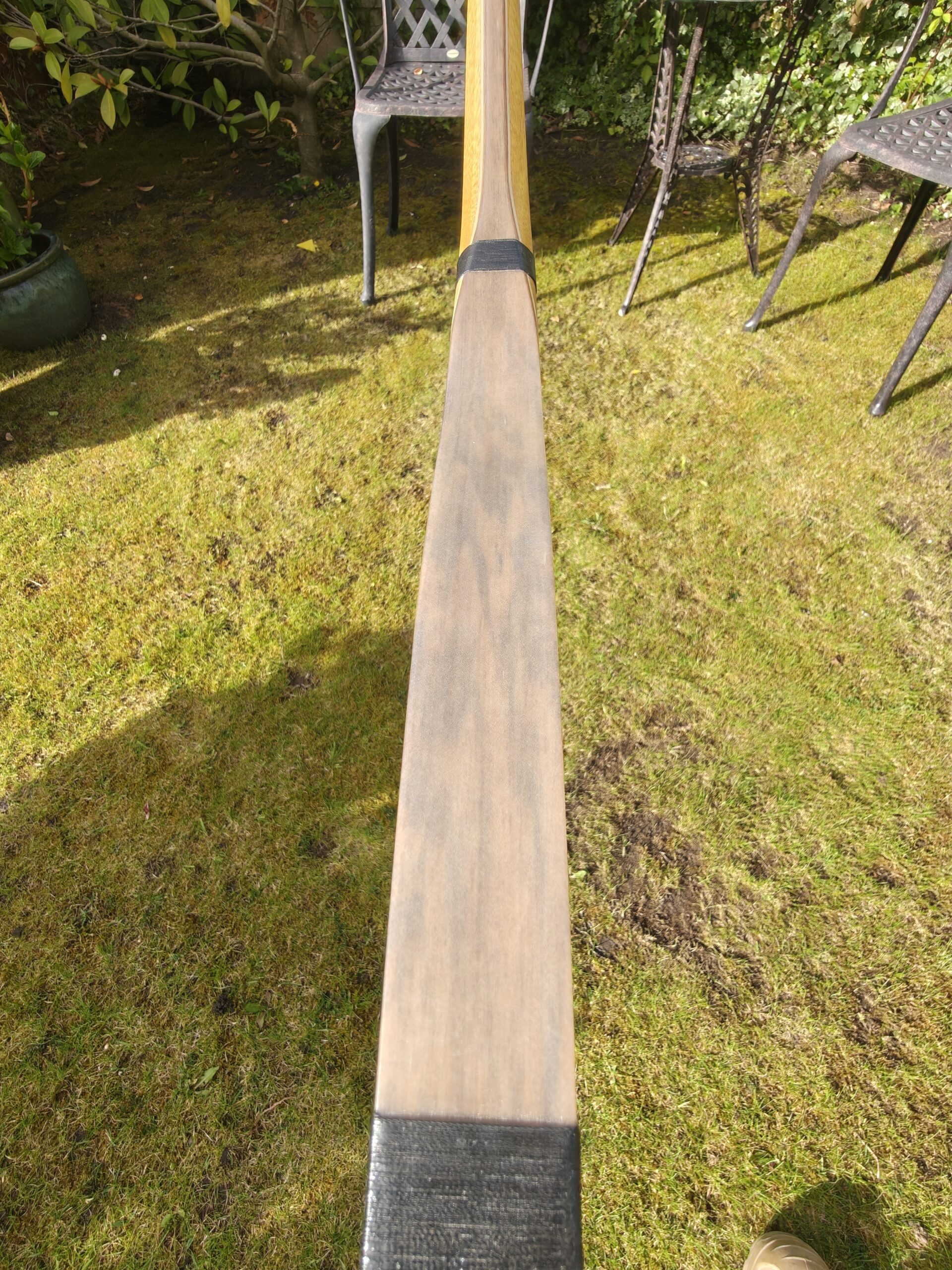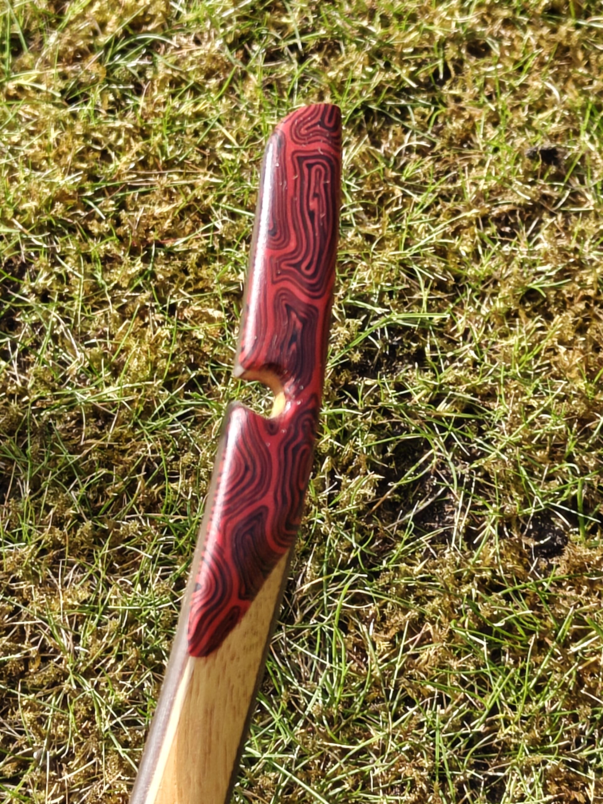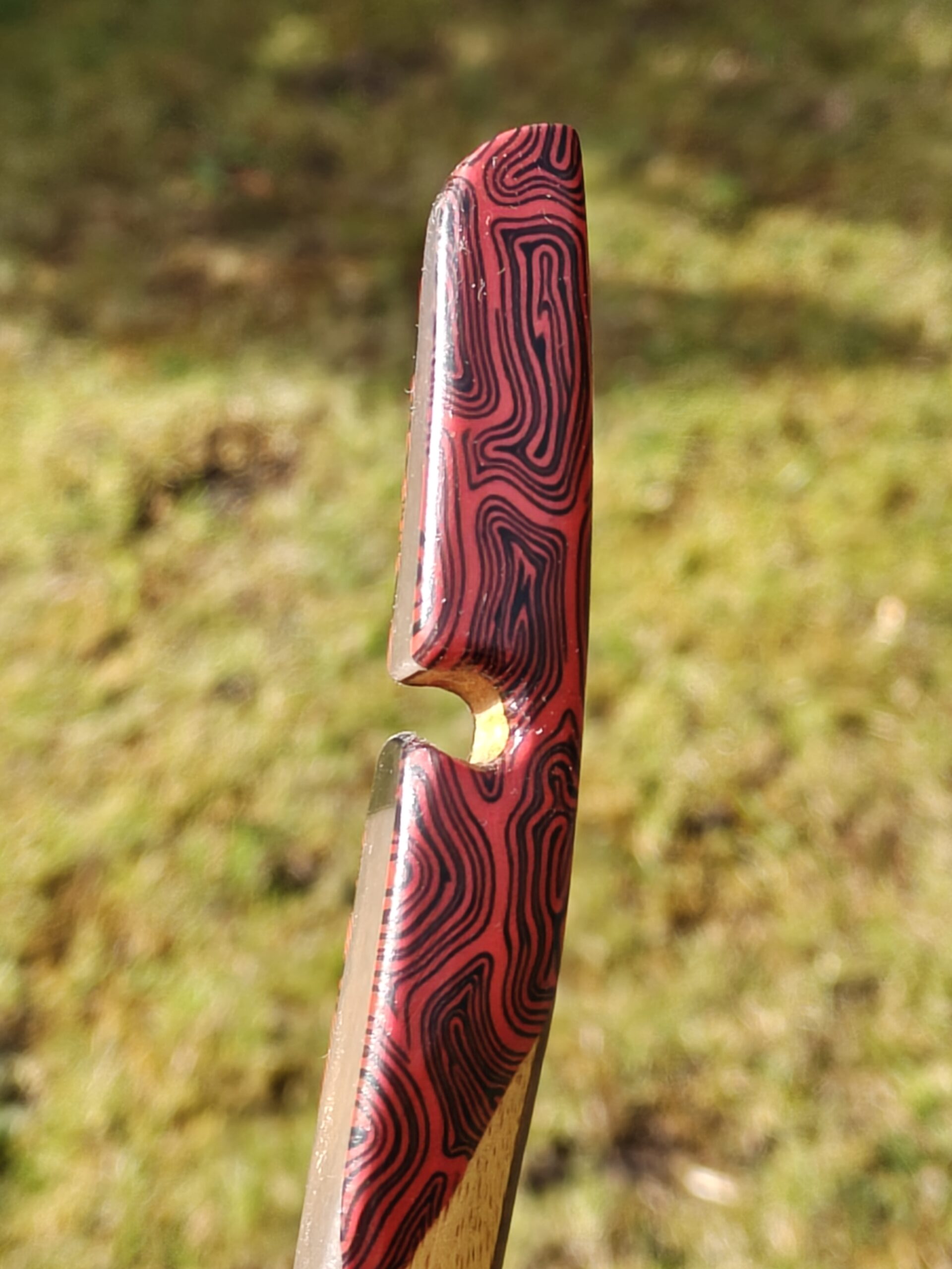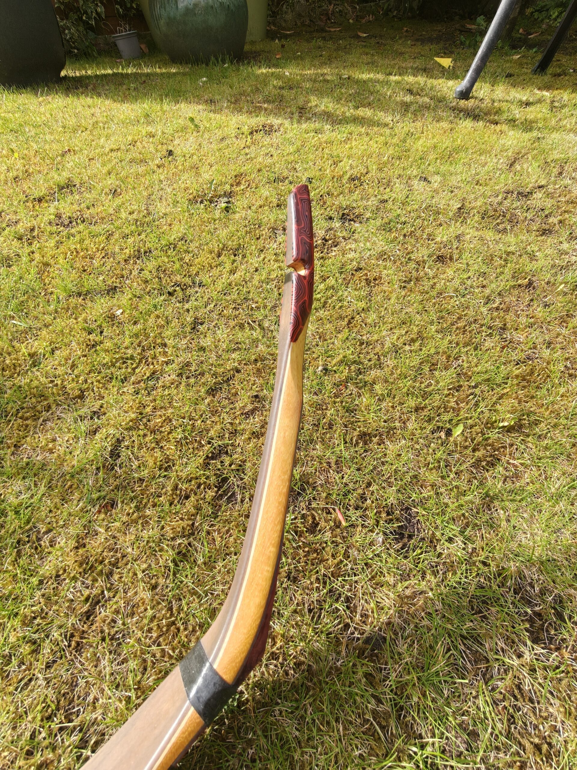 Clear glass on both sides, stabilising material on the belly side. Bamboo limbs with Spanish Walnut veneer on both sides. Osage Orange riser and siyah sections. Damascus Red G10 bow tips.