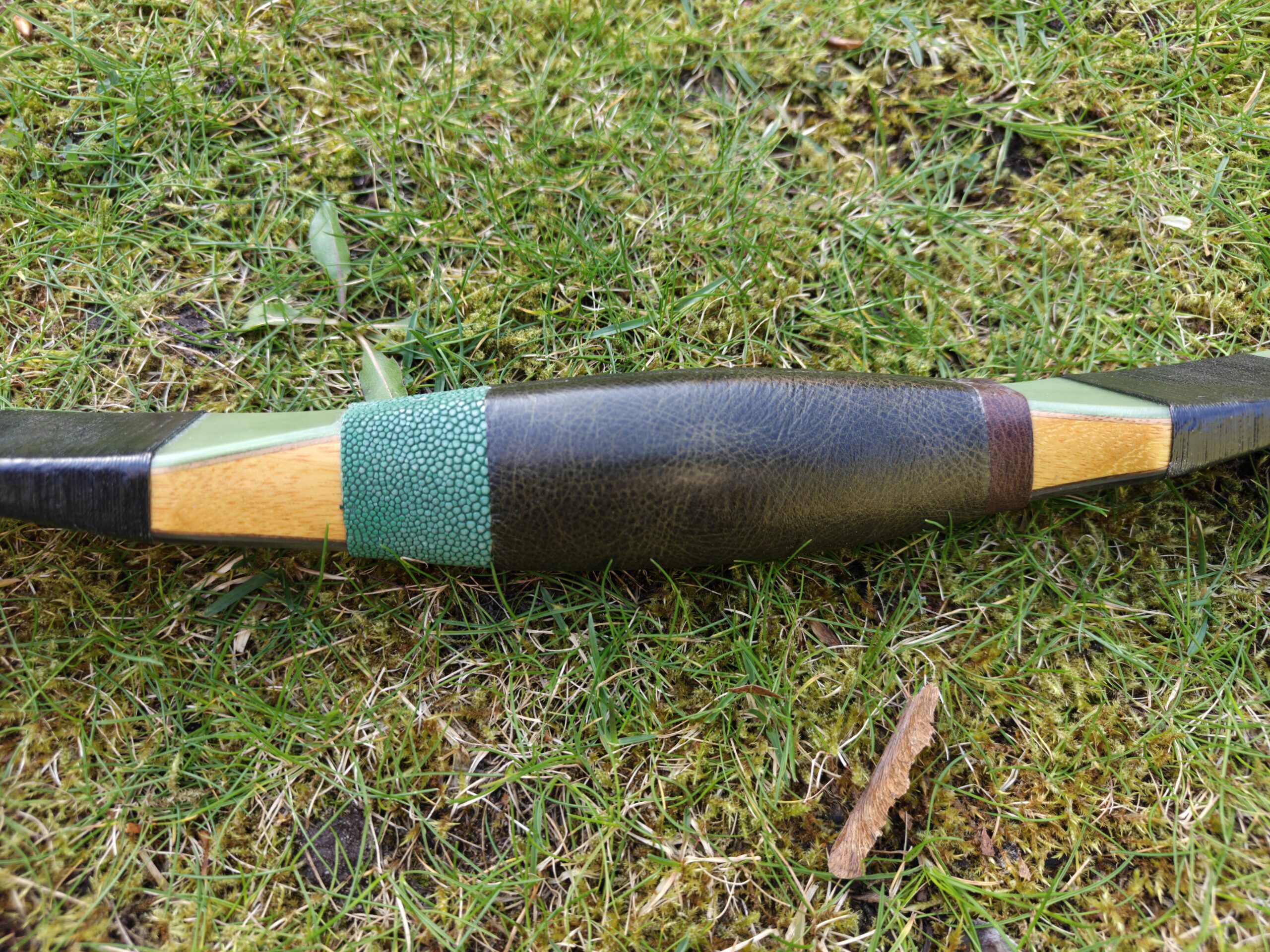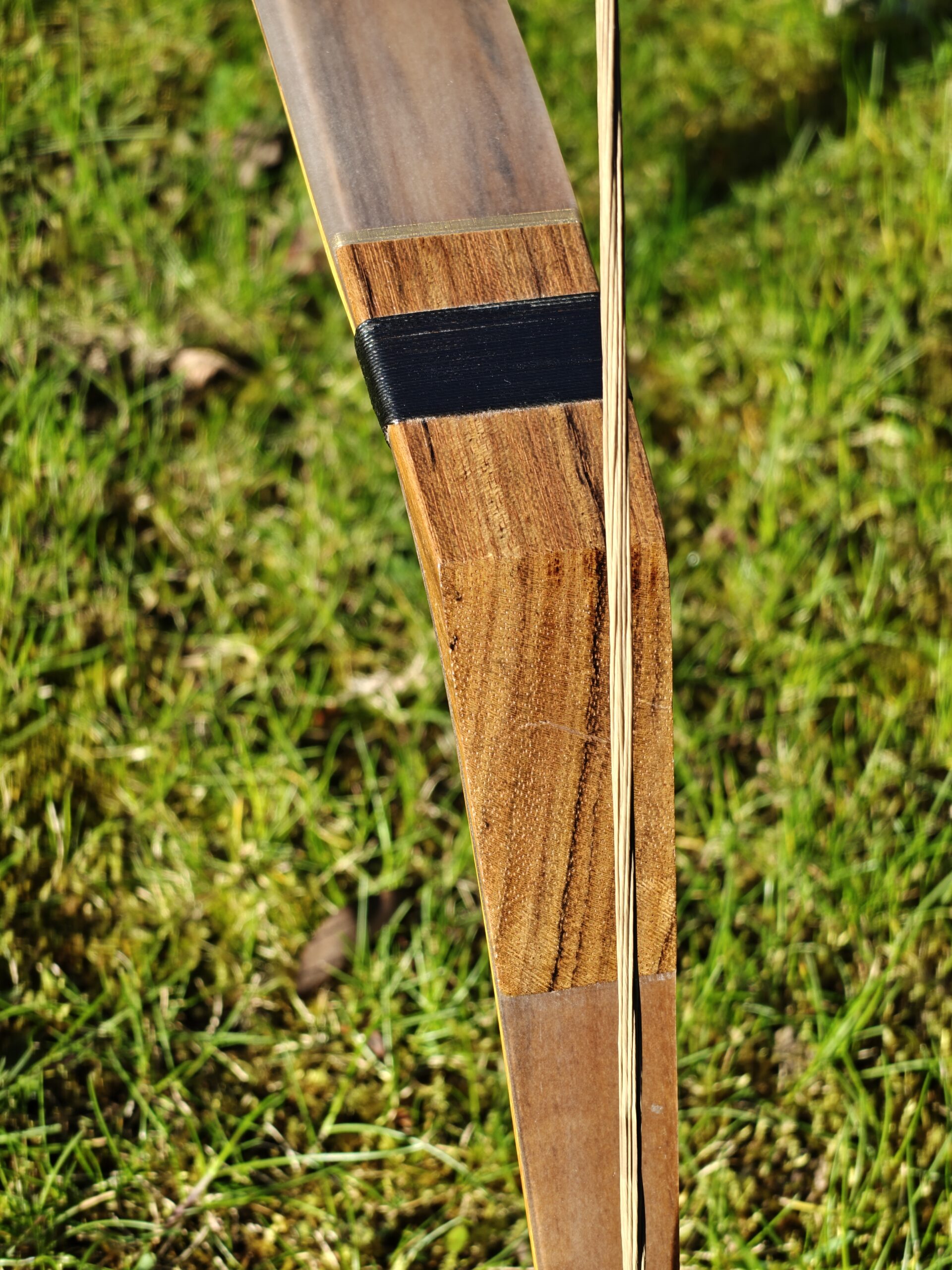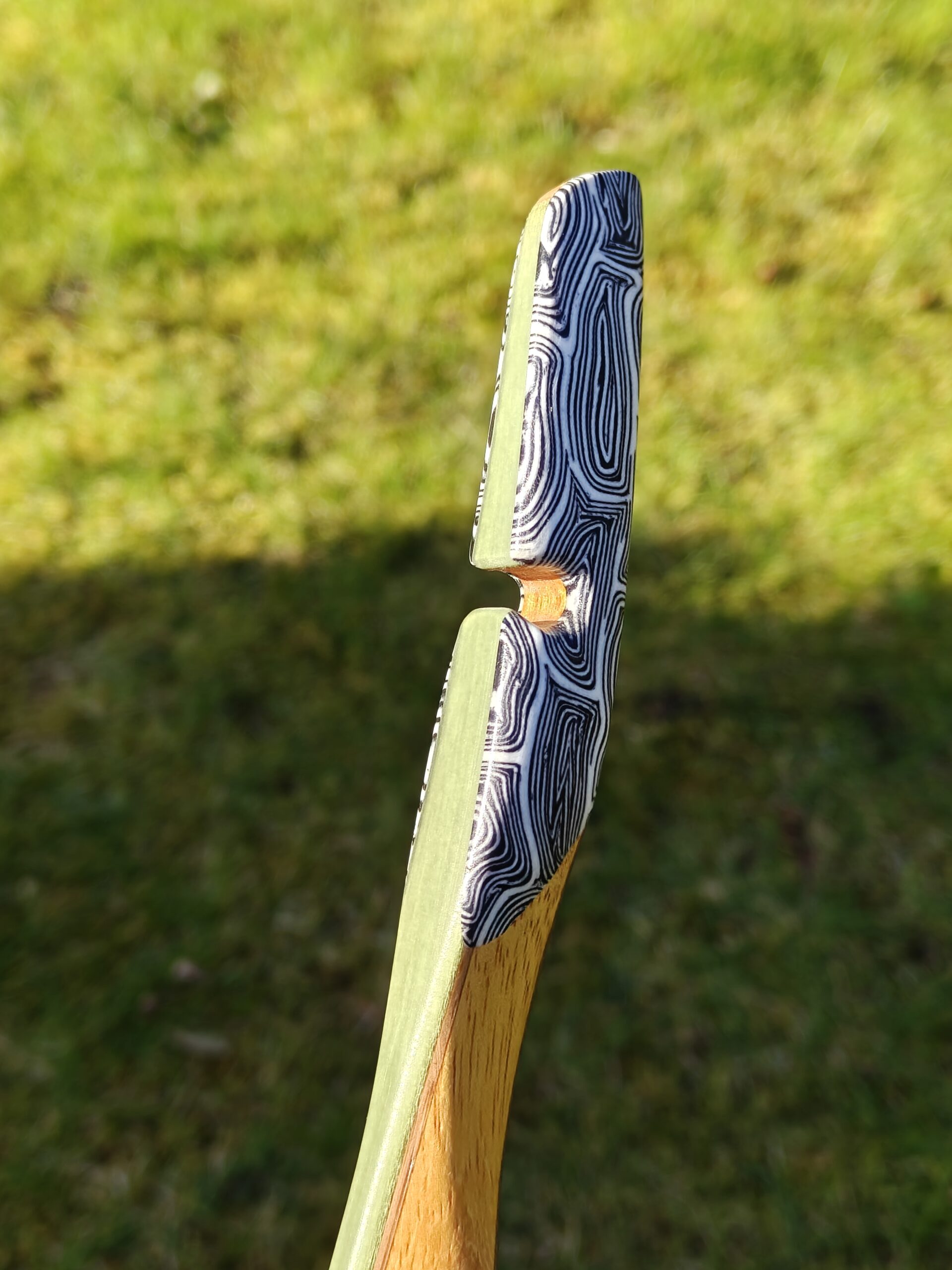 Clear glass on both sides, stabilising material on the belly side. Bamboo limbs with Green Pear veneer on the back and Spanish Walnut veneer on the belly side. Osage Orange riser and siyah sections. Damascus White G10 bow tips.