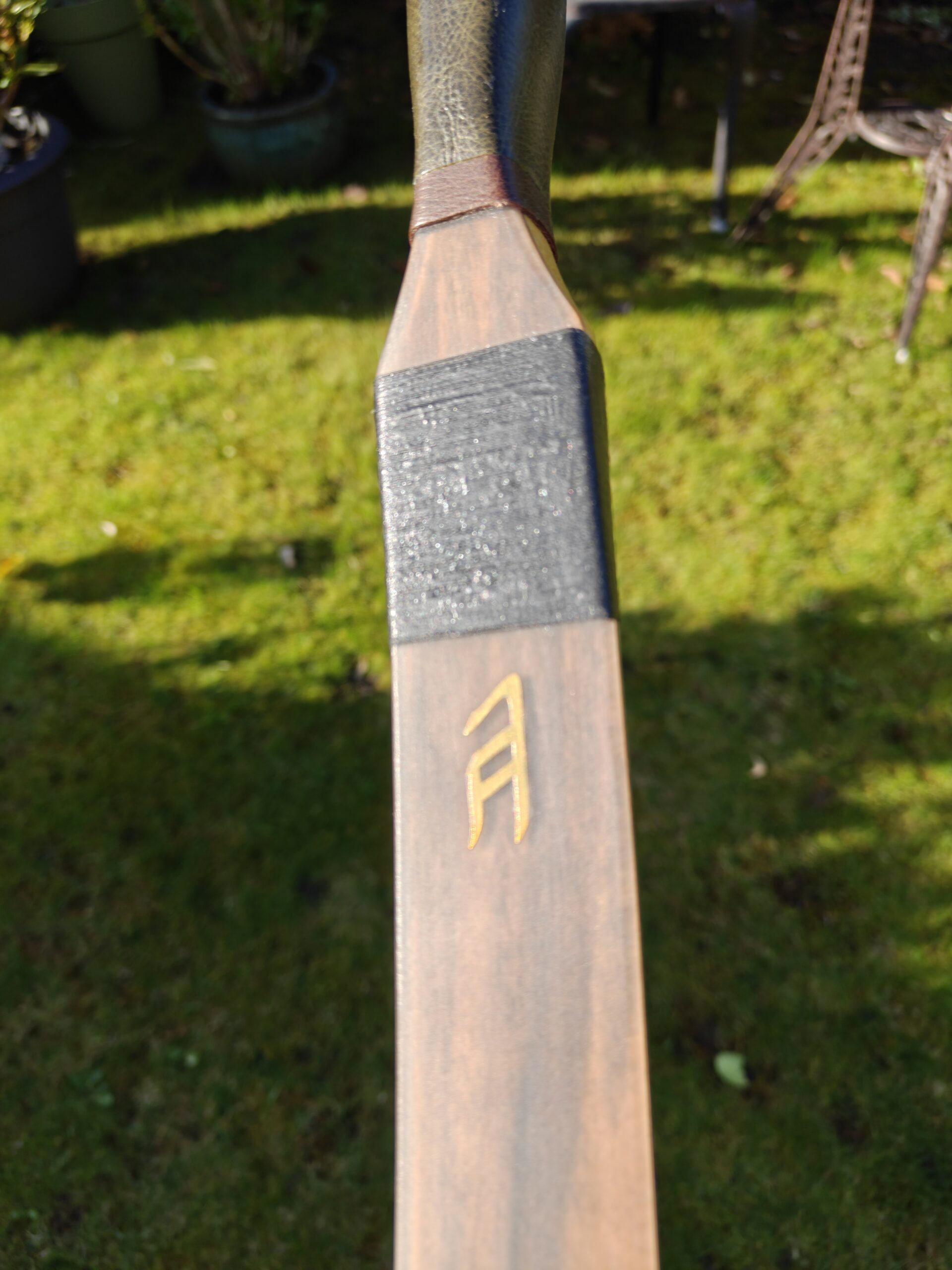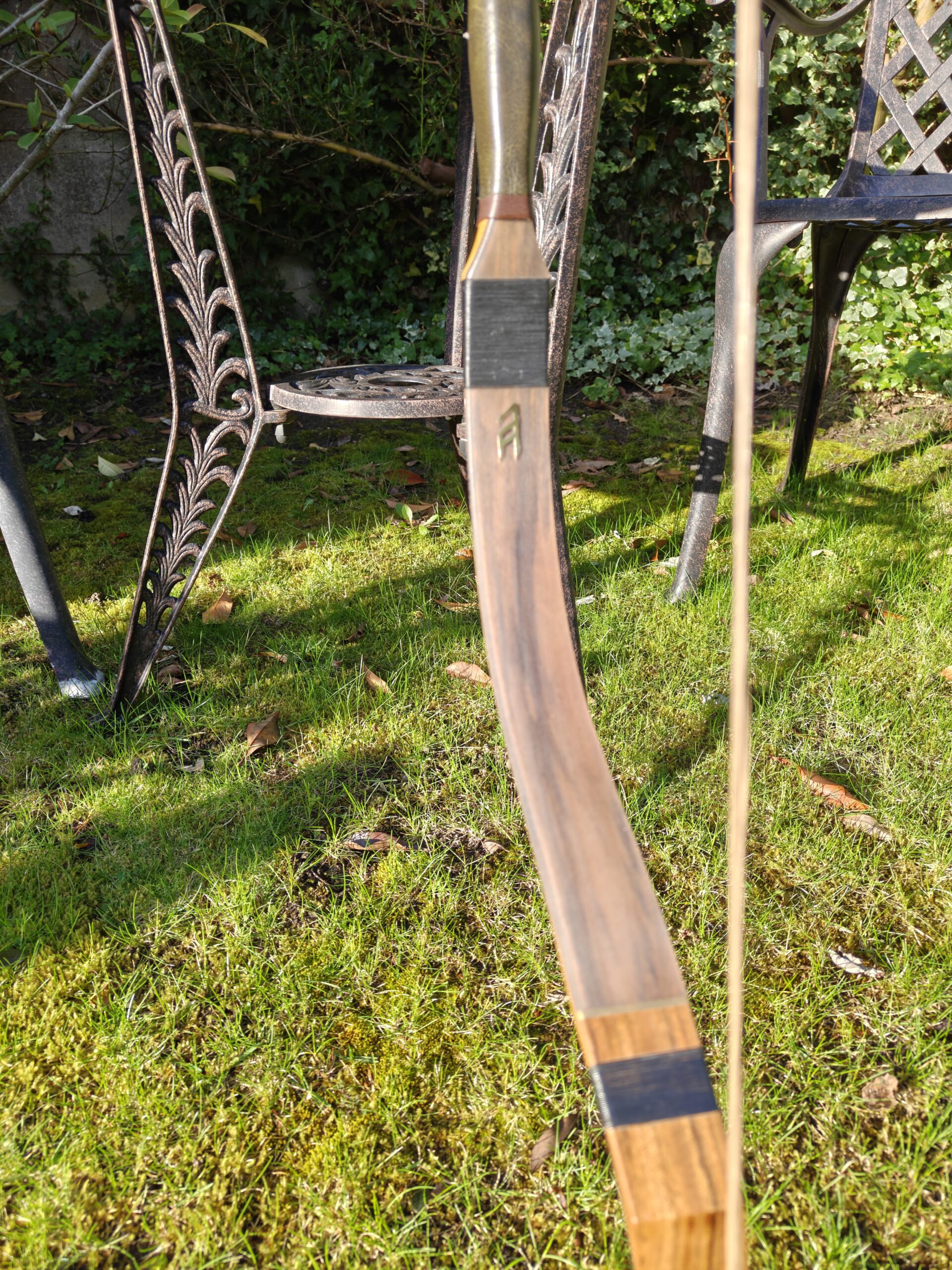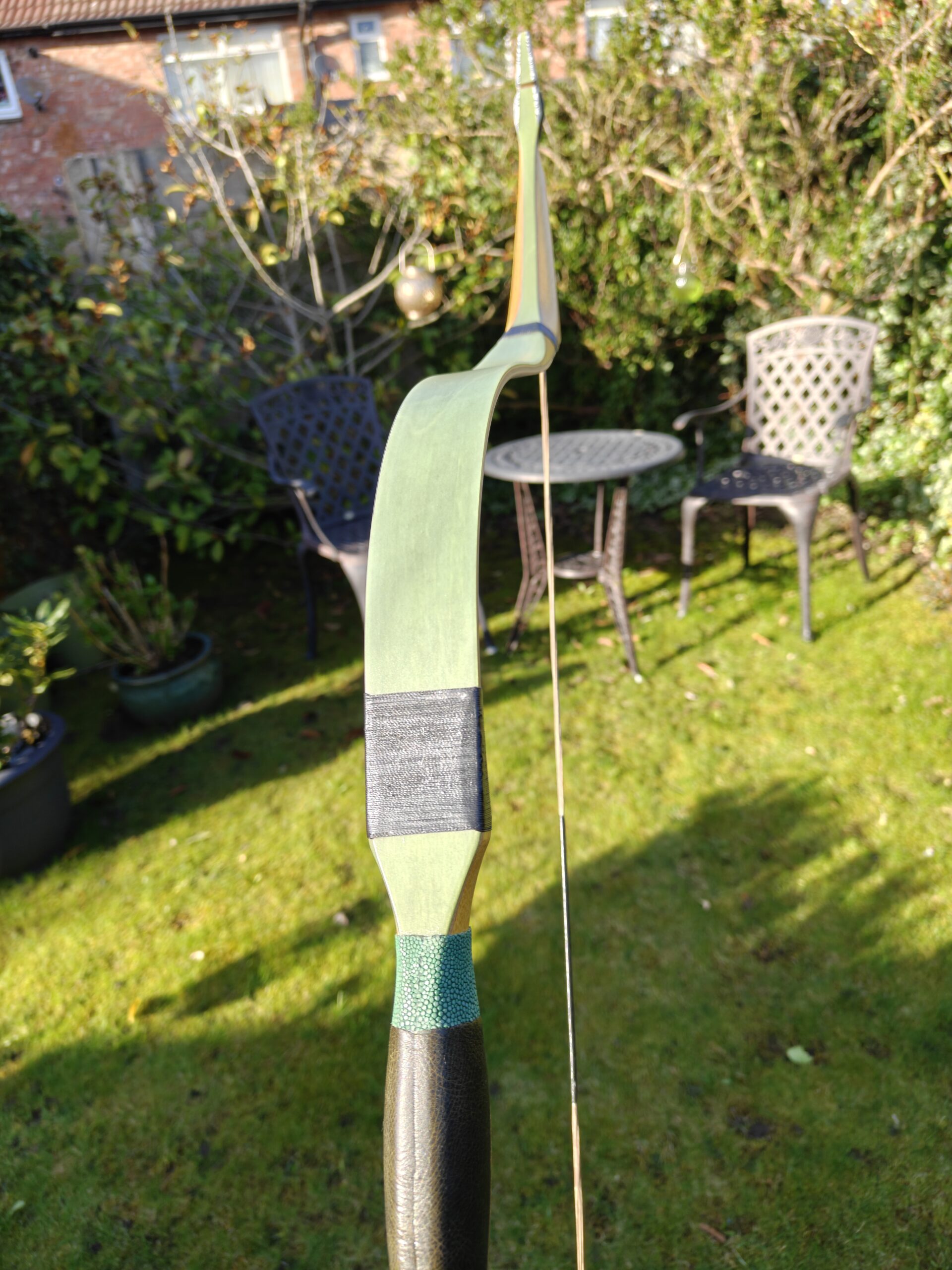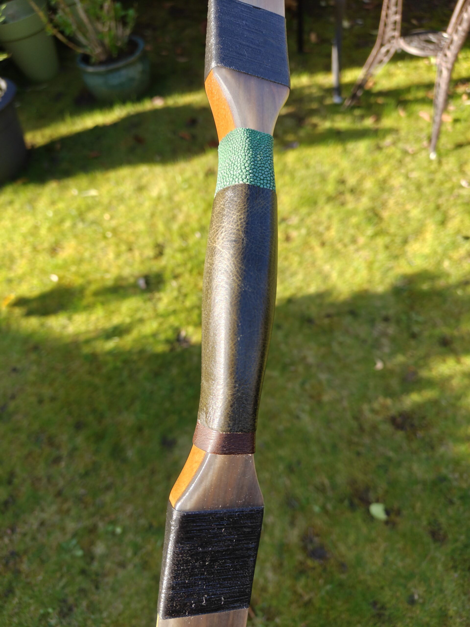 Clear glass on both sides, stabilising material on the belly side. Bamboo limbs with Green Pear veneer on the back and Spanish Walnut veneer on the belly side. Osage Orange riser and siyah sections. Damascus White G10 bow tips.